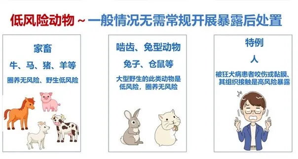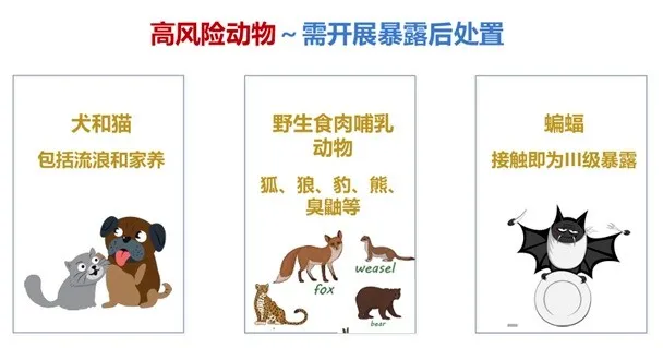 高风险动物:犬(包括家养犬和流浪犬)、猫(家猫、流浪猫)、蝙蝠,以及流浪或野生的哺乳动物(尤其肉食哺乳动物,如狐狸、狼、浣熊等)。致伤后必须按要求进行狂犬病暴露后预防处置。