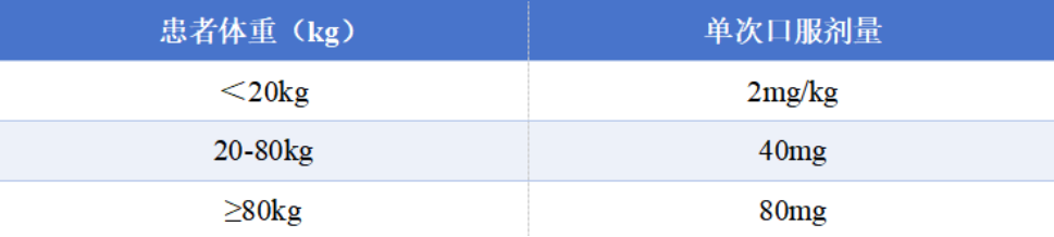 玛巴洛沙韦片剂适用于≥5岁儿童及成人,干混悬剂适用于5-12岁儿童,均为单剂次口服。基于体重的给药剂量见下表。