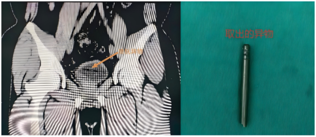 通过完善CT检查,医生发现异物已进入膀胱,随后立即给小男孩安排微创手术:膀胱镜异物取出术。这是一个在局部麻醉下,将一根带摄像头的纤细镜子经尿道置入,在直视下用精巧的器械夹取异物的过程。