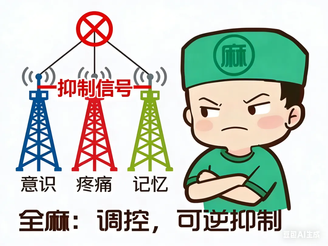 全麻的核心是“可逆性抑制”,而非“破坏性损伤”。麻醉药就像一群精准的“信号调解员”,暂时阻断大脑中负责意识、疼痛和记忆的神经信号传递,让你在手术中陷入无意识的舒适状态,全程没有疼痛和记忆。