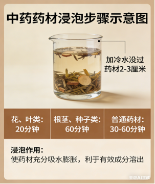将药材放入容器中,加冷水没过药材2-3厘米,浸泡30-60分钟(花、叶类药材可缩短至20分钟,根茎、种子类需延长至60分钟)。浸泡能使药材充分吸水膨胀,利于有效成分溶出。
