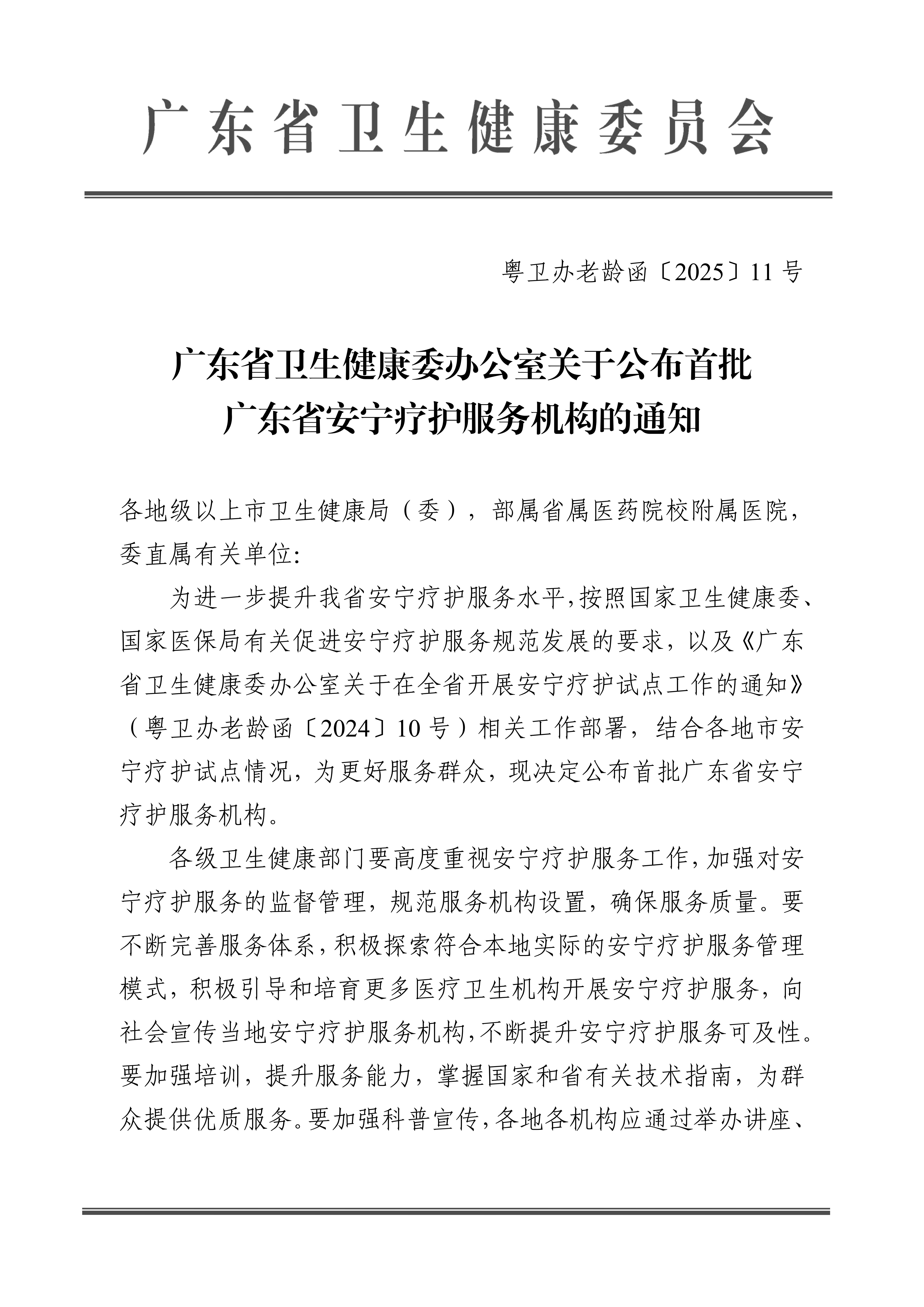 近日,我院横沥门诊部医养结合中心(东凤敬老院)正式被确定为广东省首批安宁疗护服务机构。