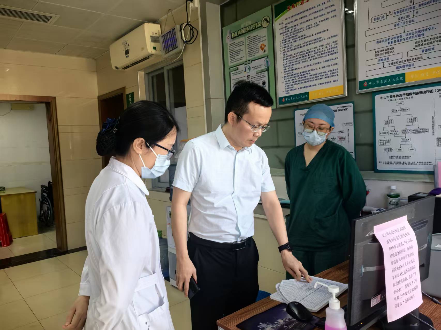 陈喜炎检查了医院发热门诊的预检分诊流程、病区管理及防控工作,并到横沥门诊部了解核酸检测开展、防蚊灭蚊及环境卫生整治等情况。陈喜炎指出,要持续坚持监测敏感性,筑牢疫情防控安全防线,确保各项措施落实到位。